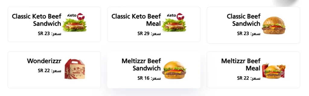 من أشهر وجبات برغرايززر: Classic Burger Box، Meltizzr Beef Meal، Wonderizzr، ووجبات الدجاج الكيتو مثل Classic Keto Chicken Meal.