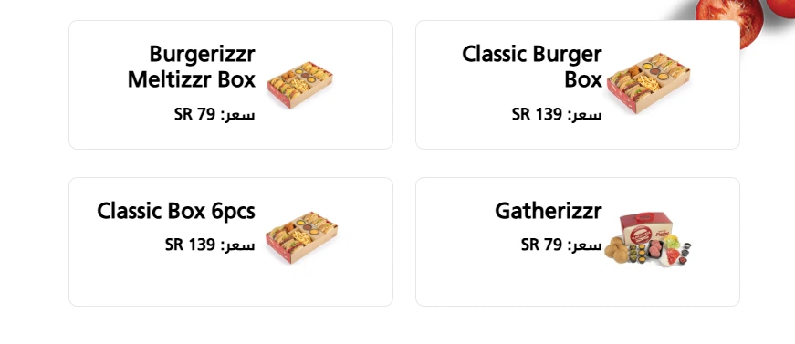 يقدّم برغرايزر منيو قائمة طعام متنوعة تلبي جميع الأذواق، من البوكسات الاقتصادية إلى برجر اللحم والدجاج، إضافة إلى الطلبات الجانبية والمشروبات. تم تقسيم القائمة بوضوح لتسهيل اختيار الوجبة المناسبة.