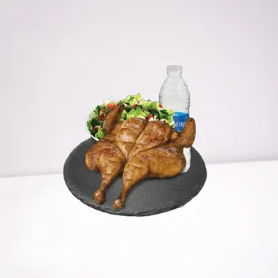 المكونات: فروج مشوي متبل، سلطة، مياه.