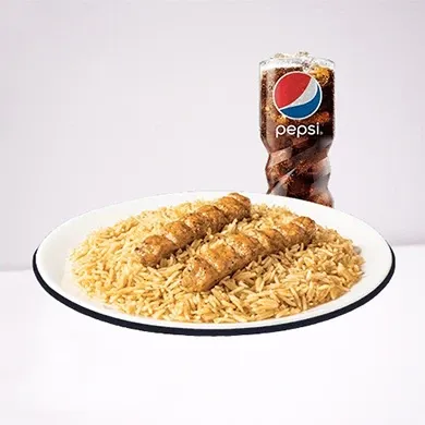 المكونات: أرز مطبوخ بتوابل فريدة مع كباب دجاج مشوي، يقدم مع مشروب.