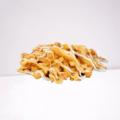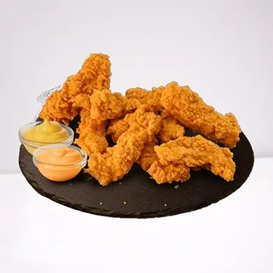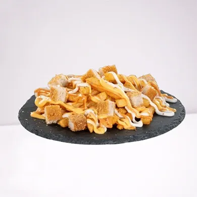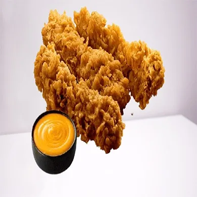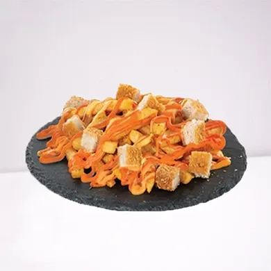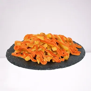 المكونات: بطاطس مقلية ذهبية، قطع دجاج مقرمشة، صوص التكا.
