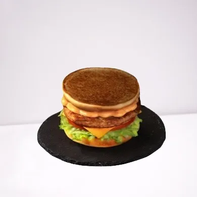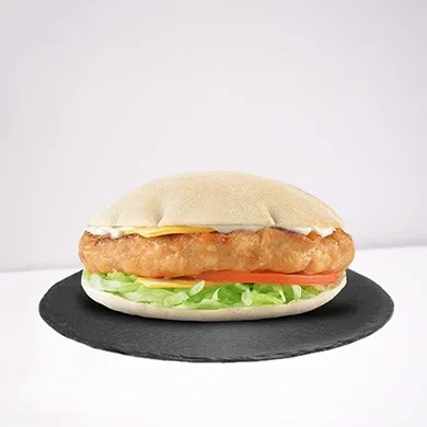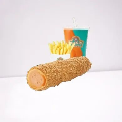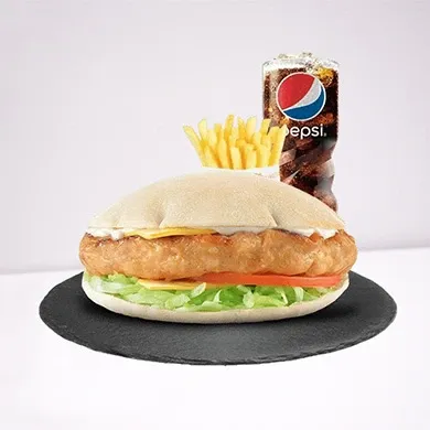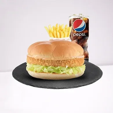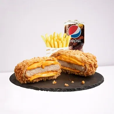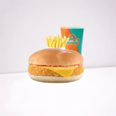 المكونات: برجر دجاج مقرمش، يقدم مع بطاطس ومشروب.