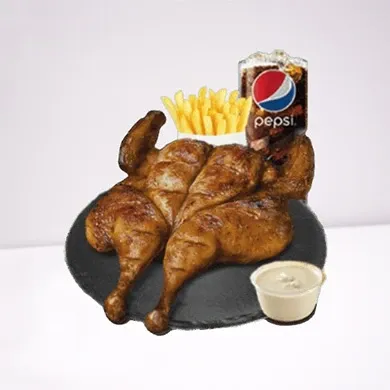 المكونات: فروج متبل مشوي، بطاطس، مشروب.